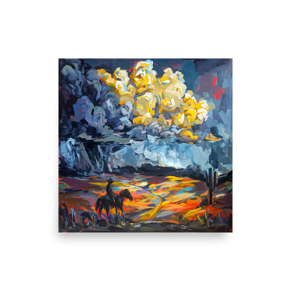 Escape Route captures that electric moment when storm clouds build and the land glows with possibility. Painted by Bria, a lone rider and horse follow a winding path through bold color and light, leaving the story open for you to imagine. Moody, vibrant, and unforgettable.