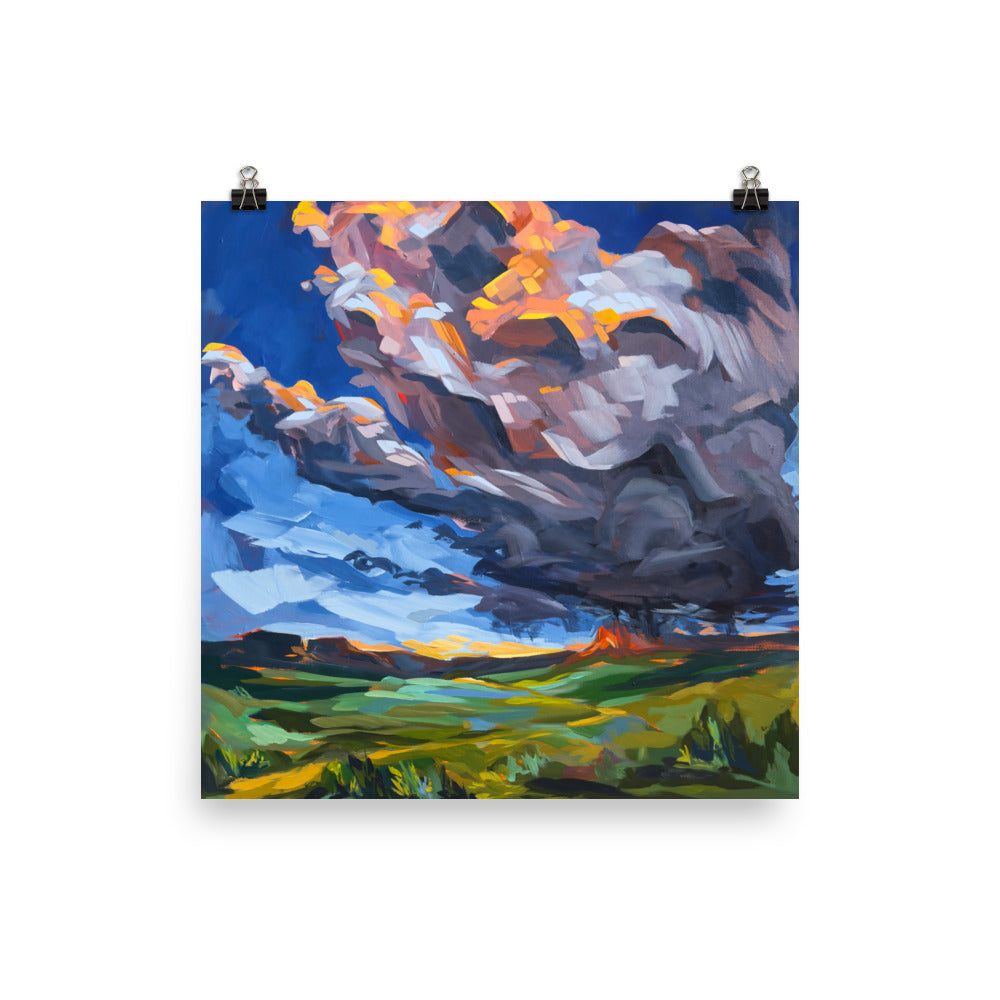 Ever stare at the horizon and think, “I should probably chase that storm”? Yeah... this is that moment, frozen in paint. In the Distance captures one of those wild western skies that makes you feel small in the best way possible. The clouds are dramatic, the light’s showing off, and the land stretches out like it’s got secrets it’s not quite ready to tell.