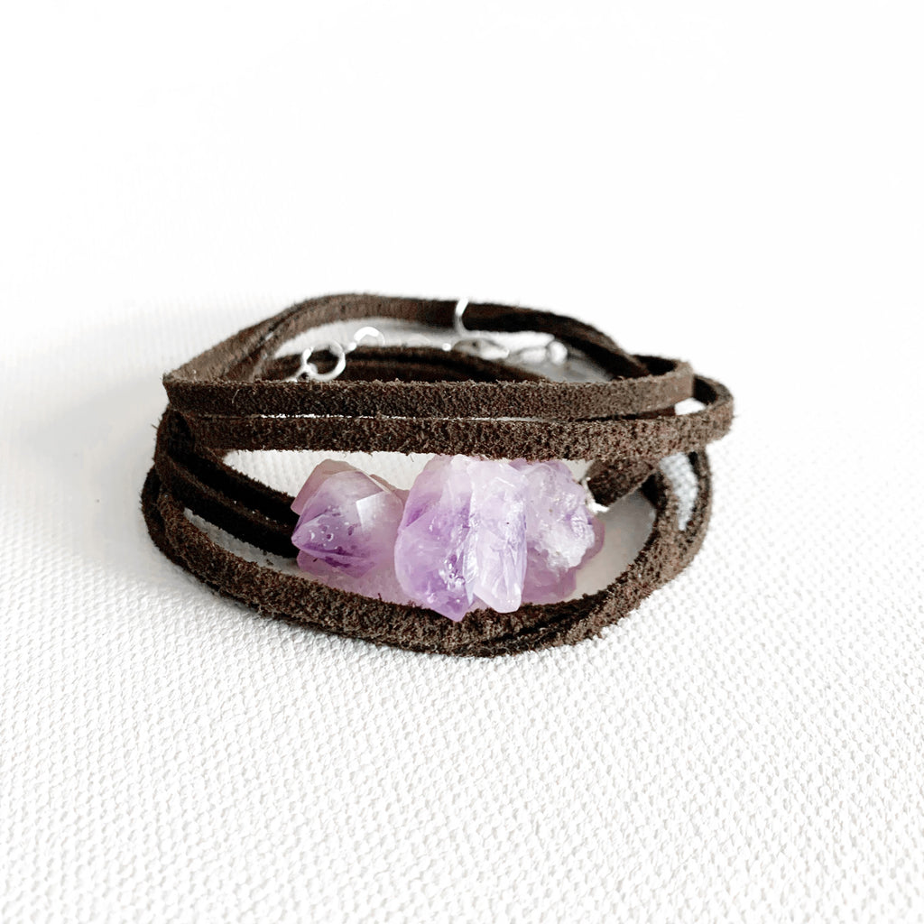 Hand-made in Wyoming, this rad leather + quartz wrap bracelet is the perfect statement piece! Sizeable with a silver lobster clasp and chain.