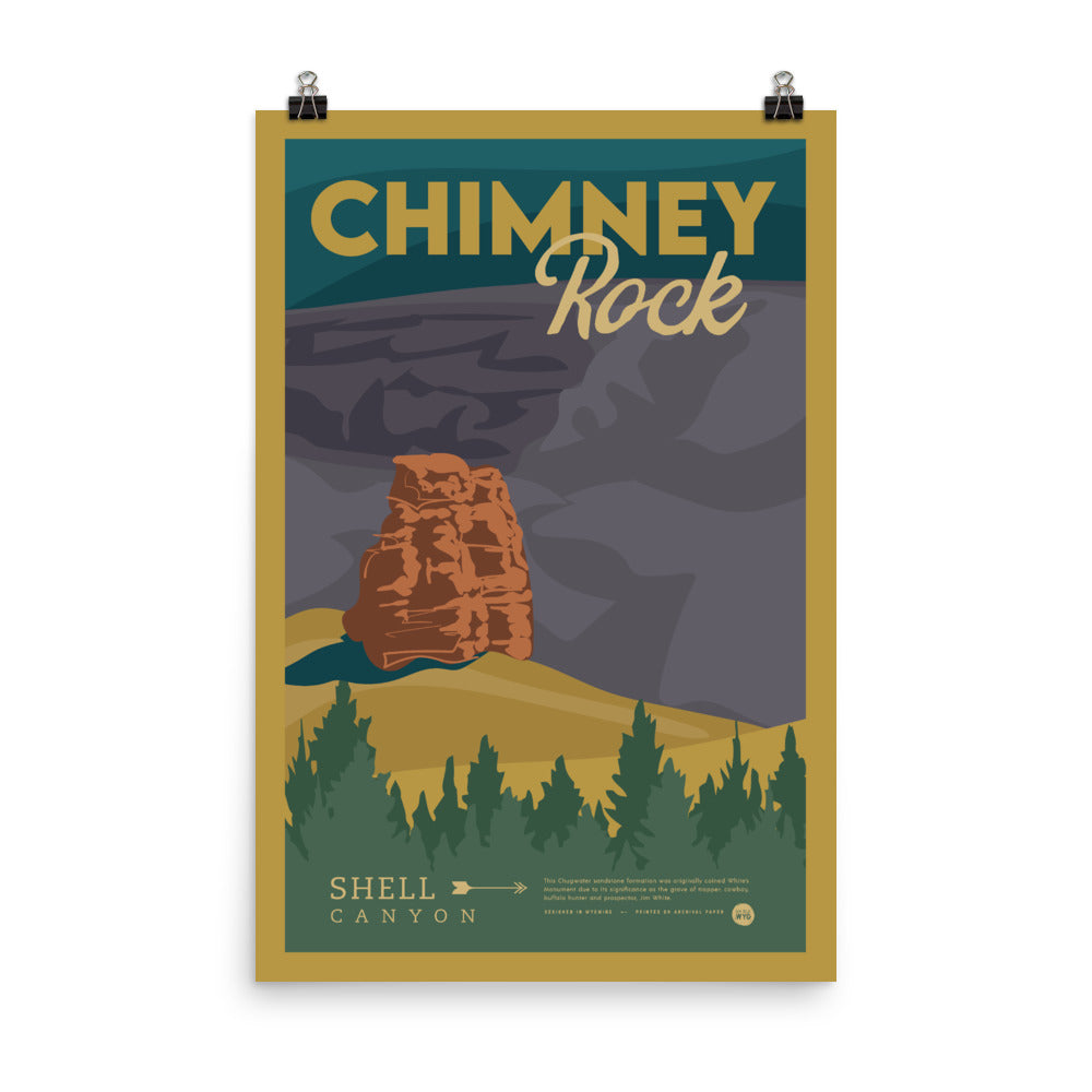 Vintage inspired and designed by our in-house artist, Bria, this Chimney Rock poster brings one of Wyoming's best right to your wall!