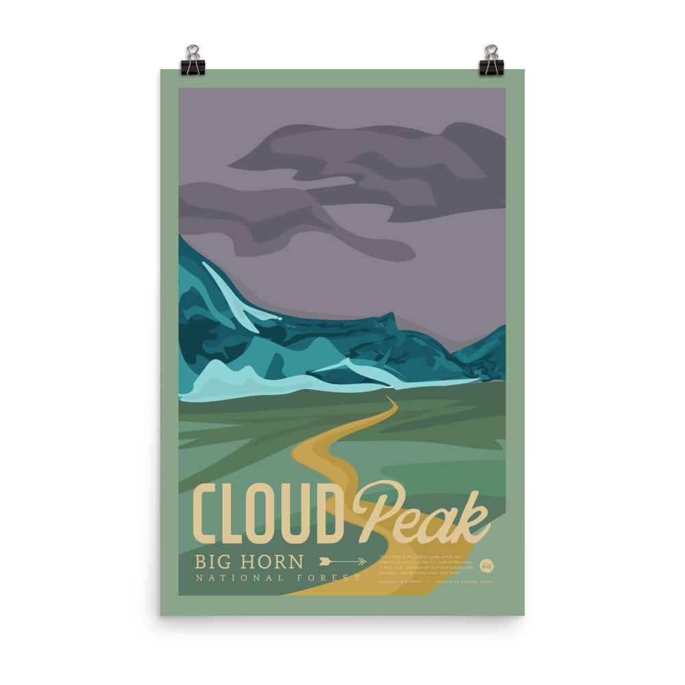 Vintage inspired and designed by our in-house artist, Bria, this Big Horn Mountain's Cloud Peak poster brings one of Wyoming's best right to your wall!