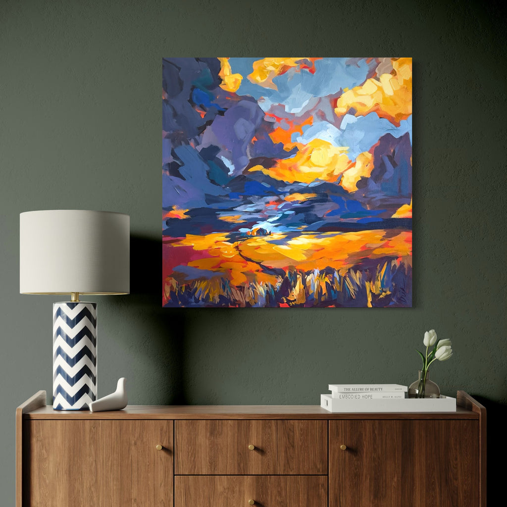 A whole Western story in one little barn. Bold color blocks, big skies, and that Bria-style drama that makes you stop and stare. It feels like a memory, a mystery, or maybe both... totally up to you. This piece brings the wide-open West indoors in the most vibrant, “dang, that’s good” kind of way.